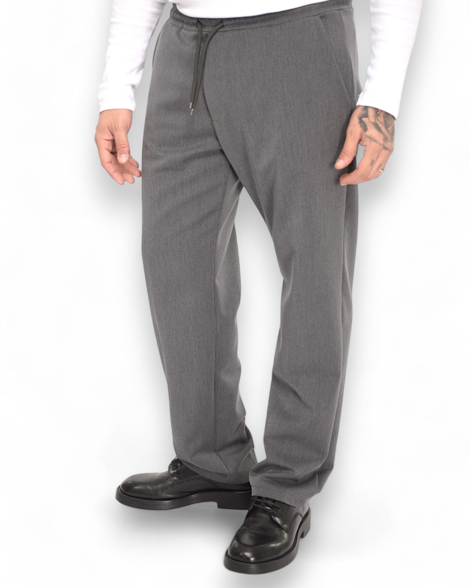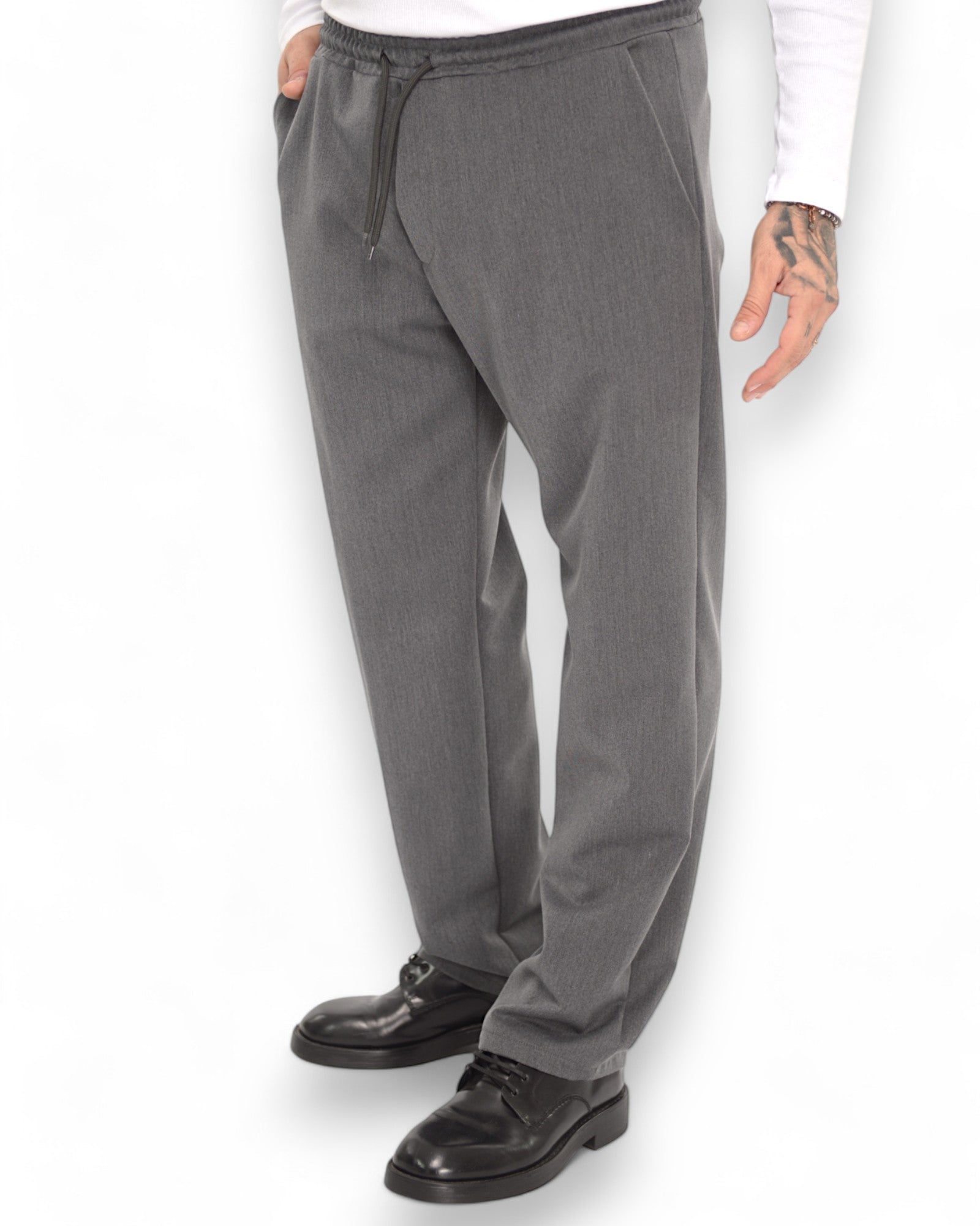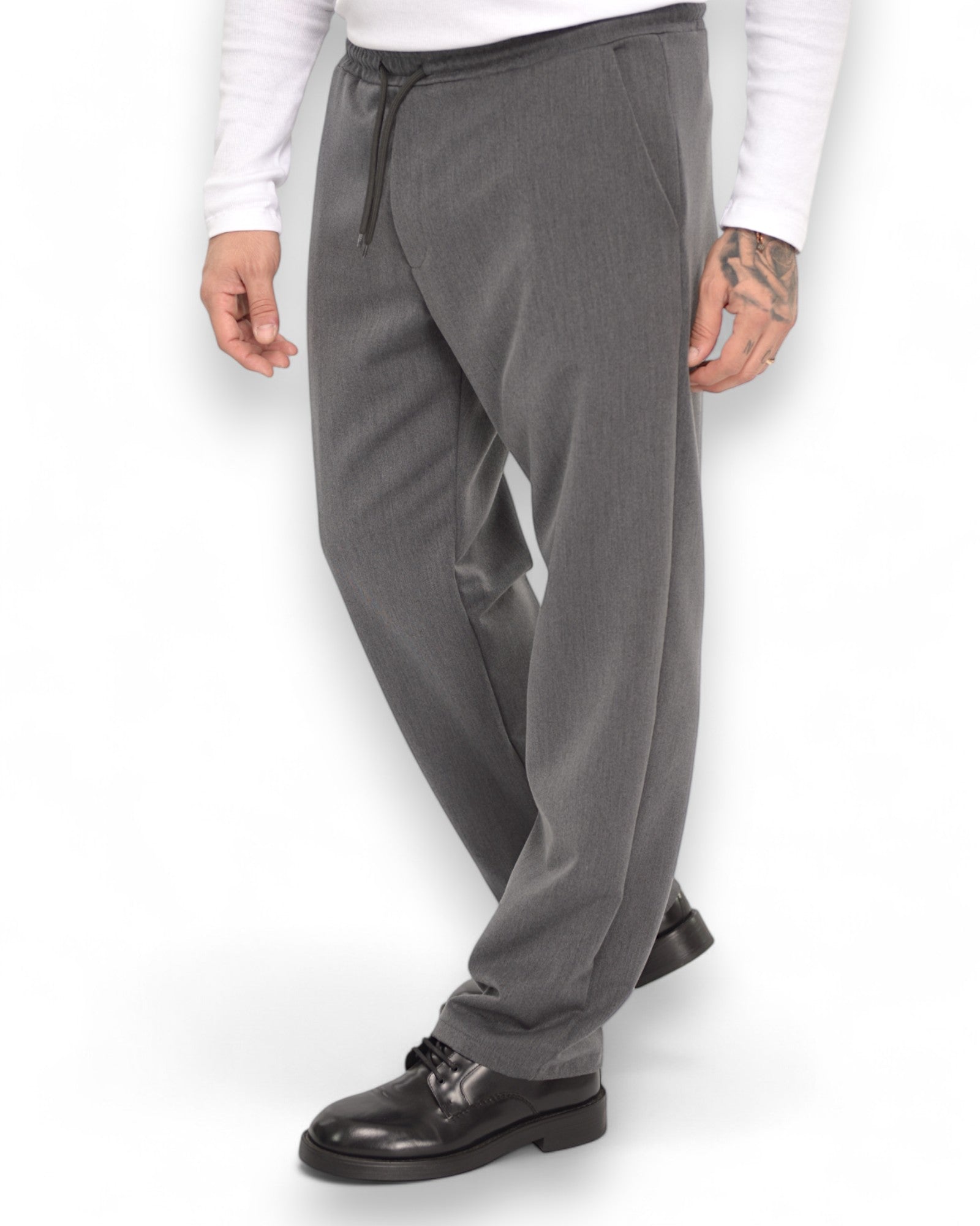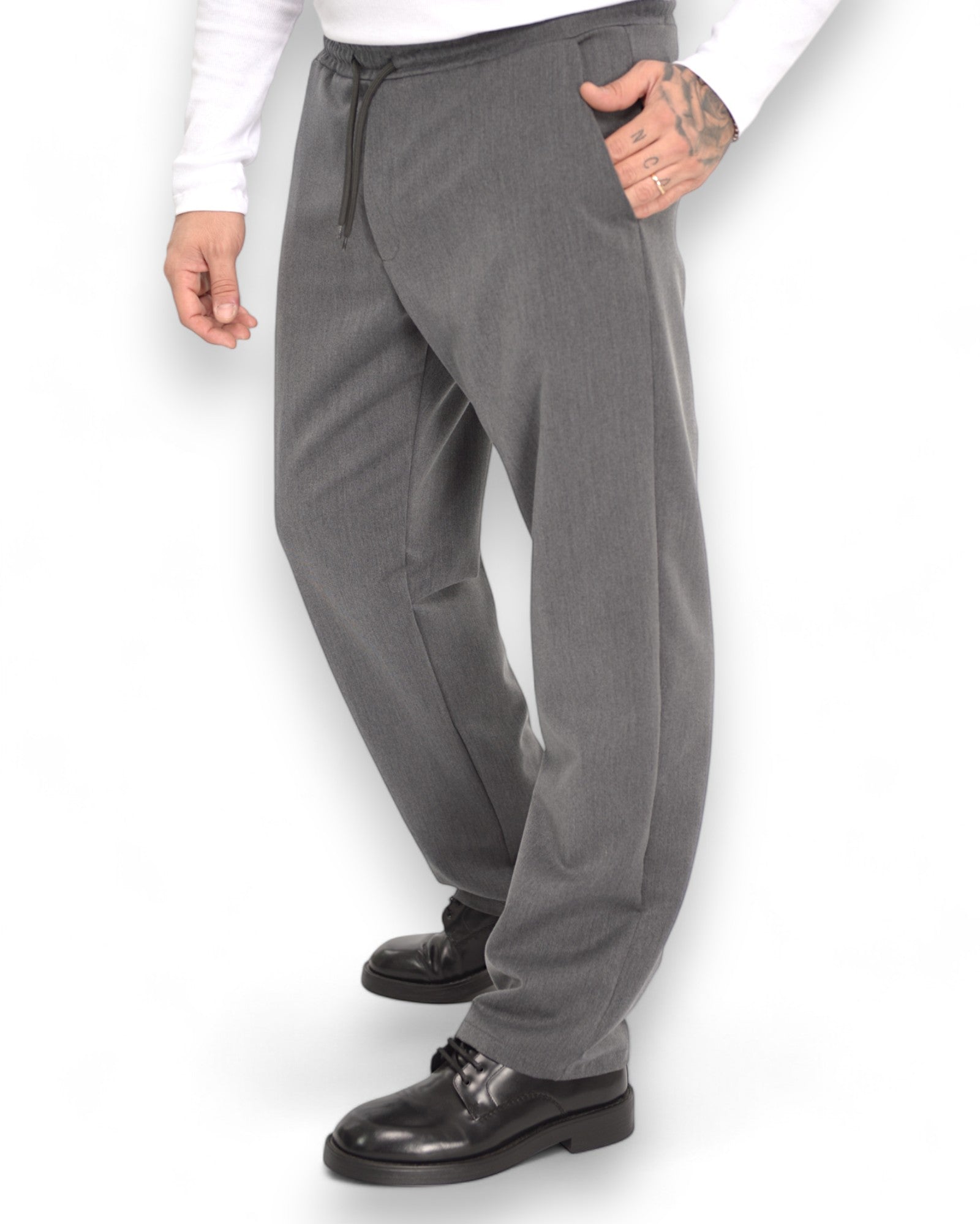 Pantalaccio fluido fondo ampio con vita elestacizzata regolabile con coulisse in misto viscosa e poliestere. Produzione e manifattura completamente italiana.Taglia indossata in foto XXL per altezza 1,85 e 97 Kg.