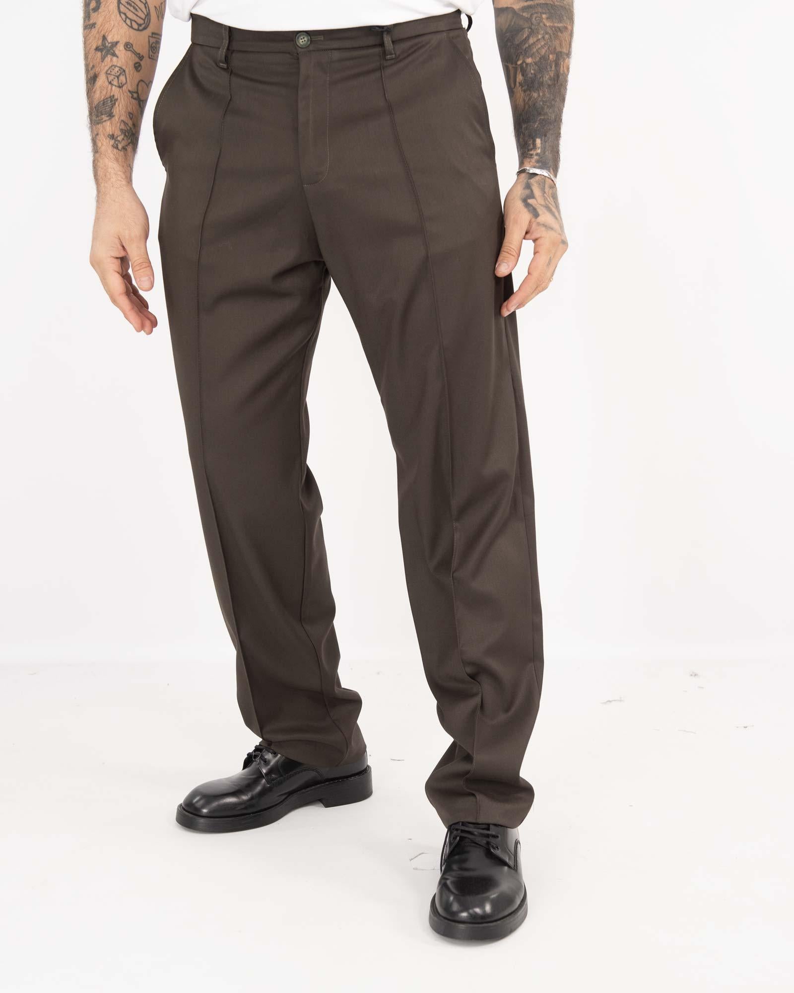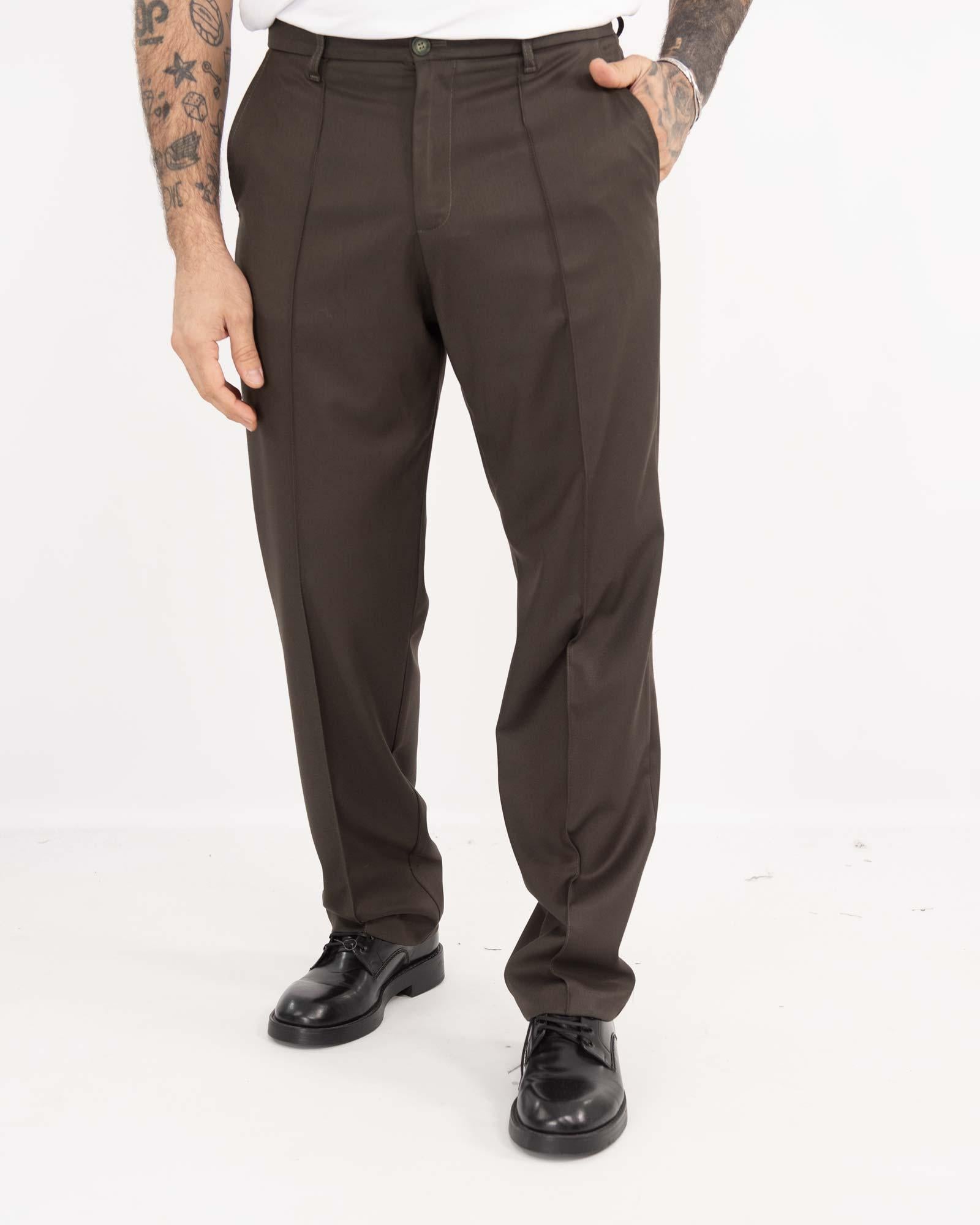Pantaloni regular fit fondo ampio realizzato in misto poliestere e viscosa. Vita alta, tasche anteriori e dettaglio di tasche posteriori a filetto. Chiusura frontale con cerniera e bottone. Il modello in foto indossa la 54 ed è alto 1,85cm e pesa 97kg.