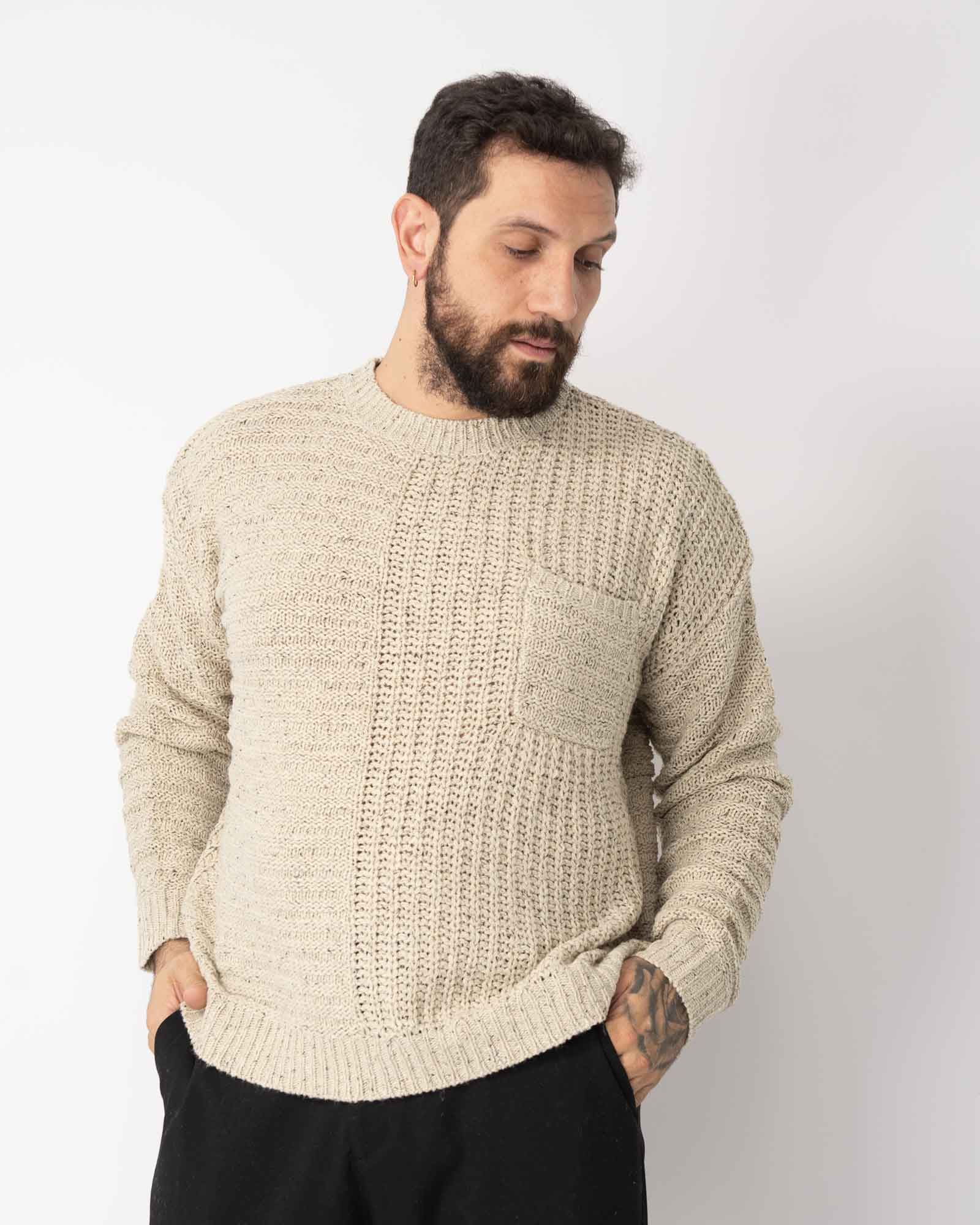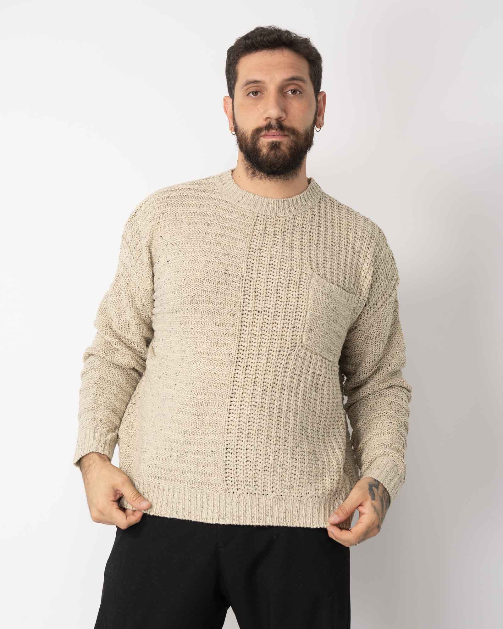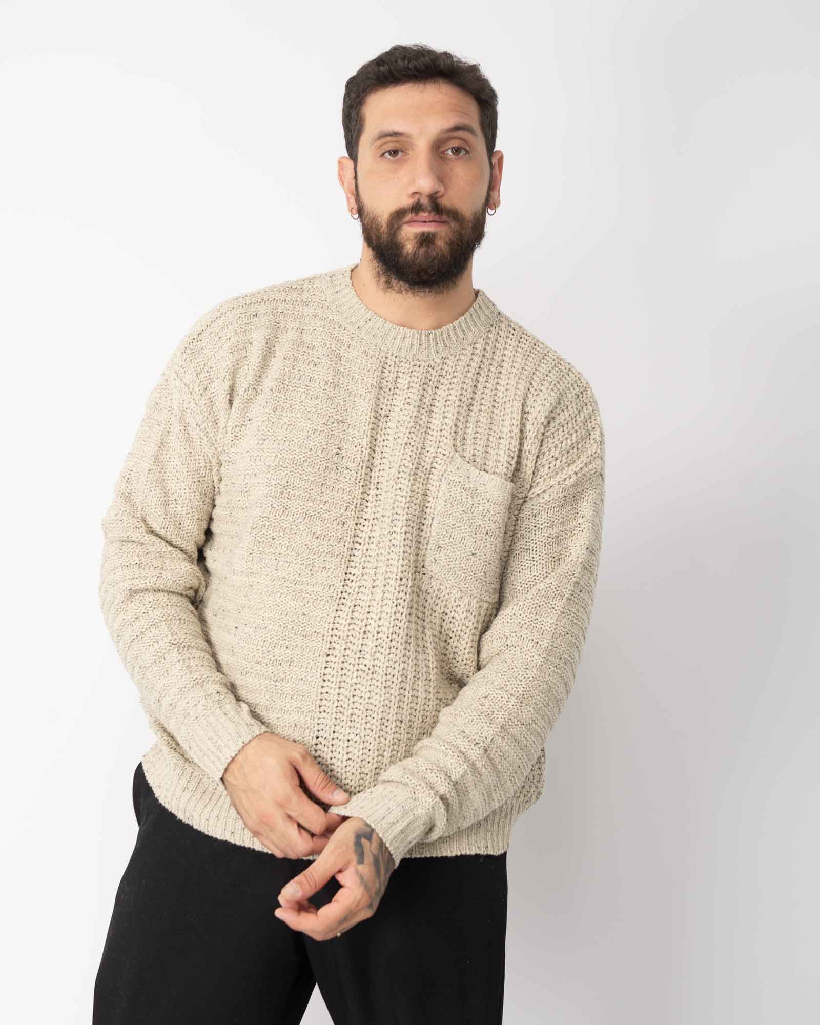 Pullover relaxed fit in filato con collo rotondo e maniche lunghe, presenta finiture a coste e vestibilità morbida. In foto è infossata taglia XL per altezza 1.85cm e peso 97kg.